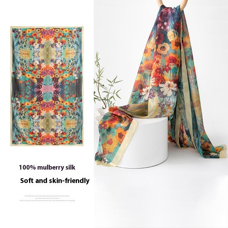 Spring 100% Mulberry Silk Scarf Women's Thin Shawl Silk Oil Painting Retro Plain Crepe Satin Premium Long Scarf
