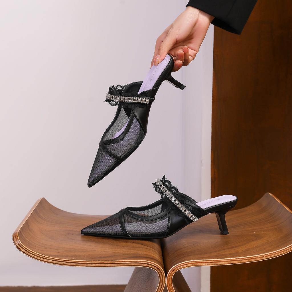 59015 High Heels Women's Thick Heel Summer 2025 New Bag Head Mesh Cool Slippers Pointed Rhinestone Single Shoes