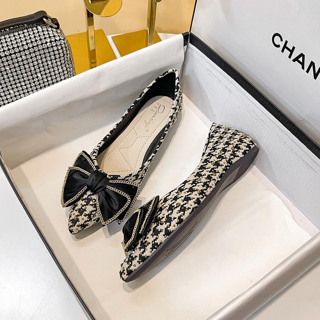 Fashion Elegant Bowknot Flats Women Houndstooth Ballets Shoes Shallow Pointed Toe Rivets Loafers Female Office Dress Slip On Ballerinas