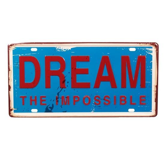 This Dream-the-Impossible metal tin sign features a unique retro design inspired by classic license plates and motivational quotes. Made from high-quality durable metal, it offers a long-lasting finish with a slightly distressed, look that makes it appear like an authentic collectible.