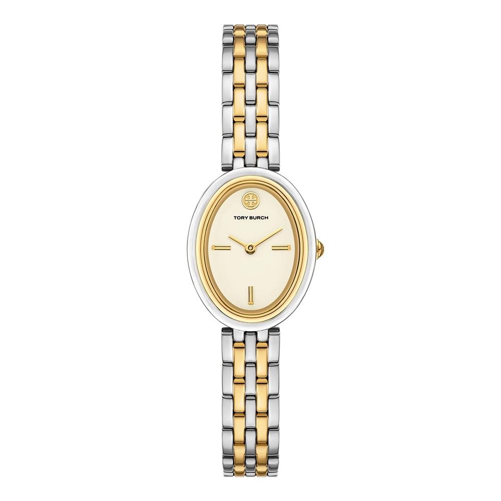 The Tory Burch Oval Women's Metal Watch TBW6033 is crafted from stainless steel, exemplifying elegance and durability. This watch features a minimalist design with a round face, showcasing the time in hours and minutes. The band is also made of stainless steel with a width of 10mm, ensuring a comfortable and secure fit. The case diameter is 28mm with a thickness of 7mm. The watch is equipped with quartz movement and protected by a mineral crystal glass. It also offers a water resistance of up to 30 meters (3ATM), making it suitable for light water activities.
