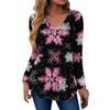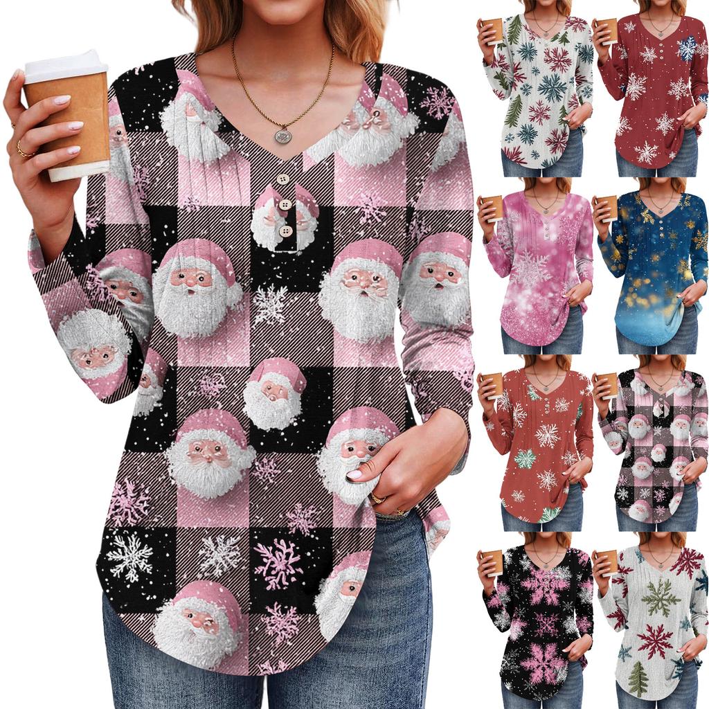 Women's Fashion Casual Christmas Tree Print V-Neck Decorative Button Long Sleeve T-Shirt Top