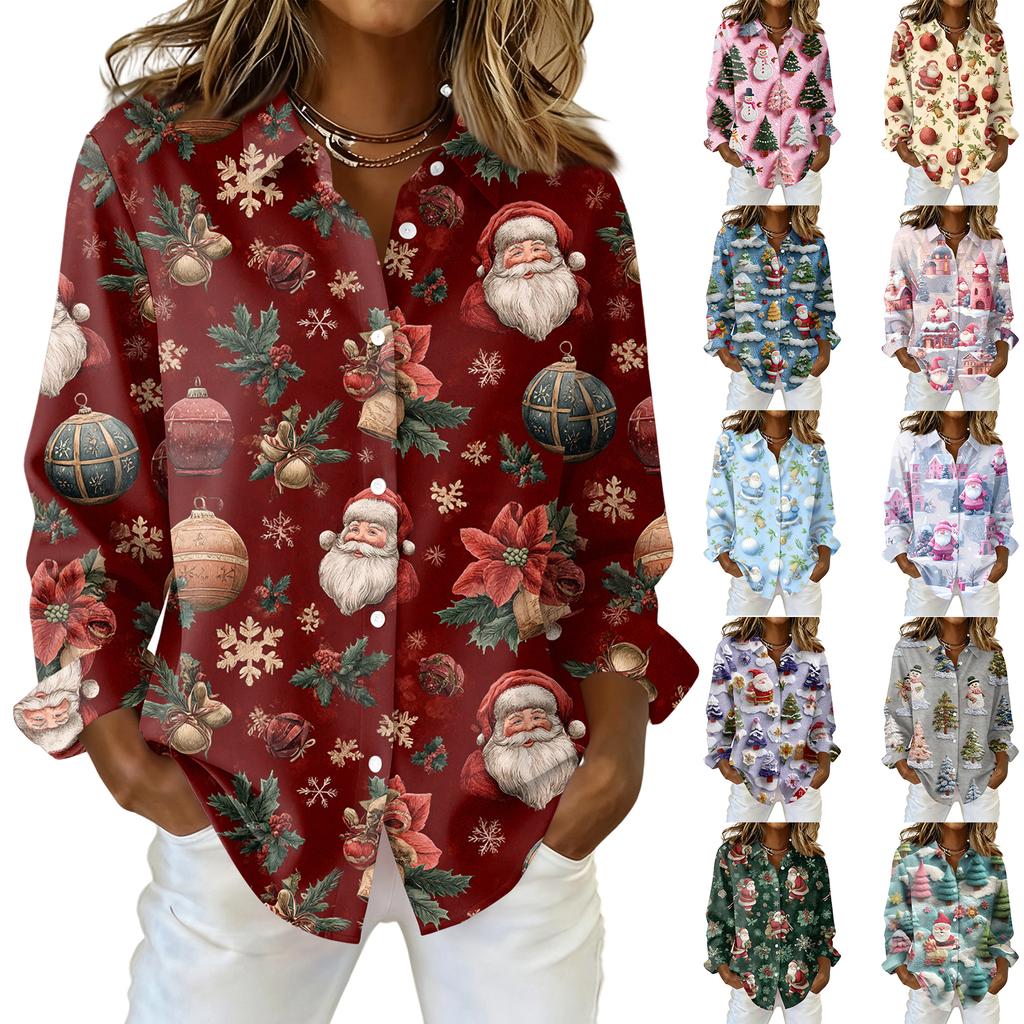 Women's Christmas Printed Button Up Long Sleeved Casual Regular Shirt With Collar Top — buy online with free worldwide shipping!