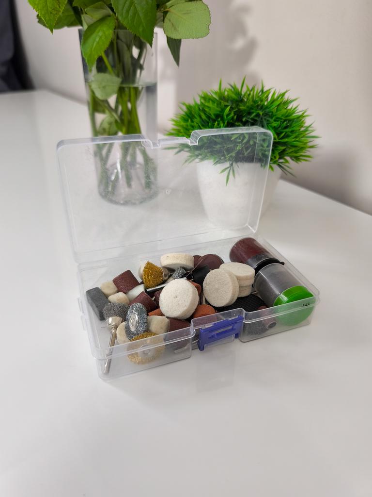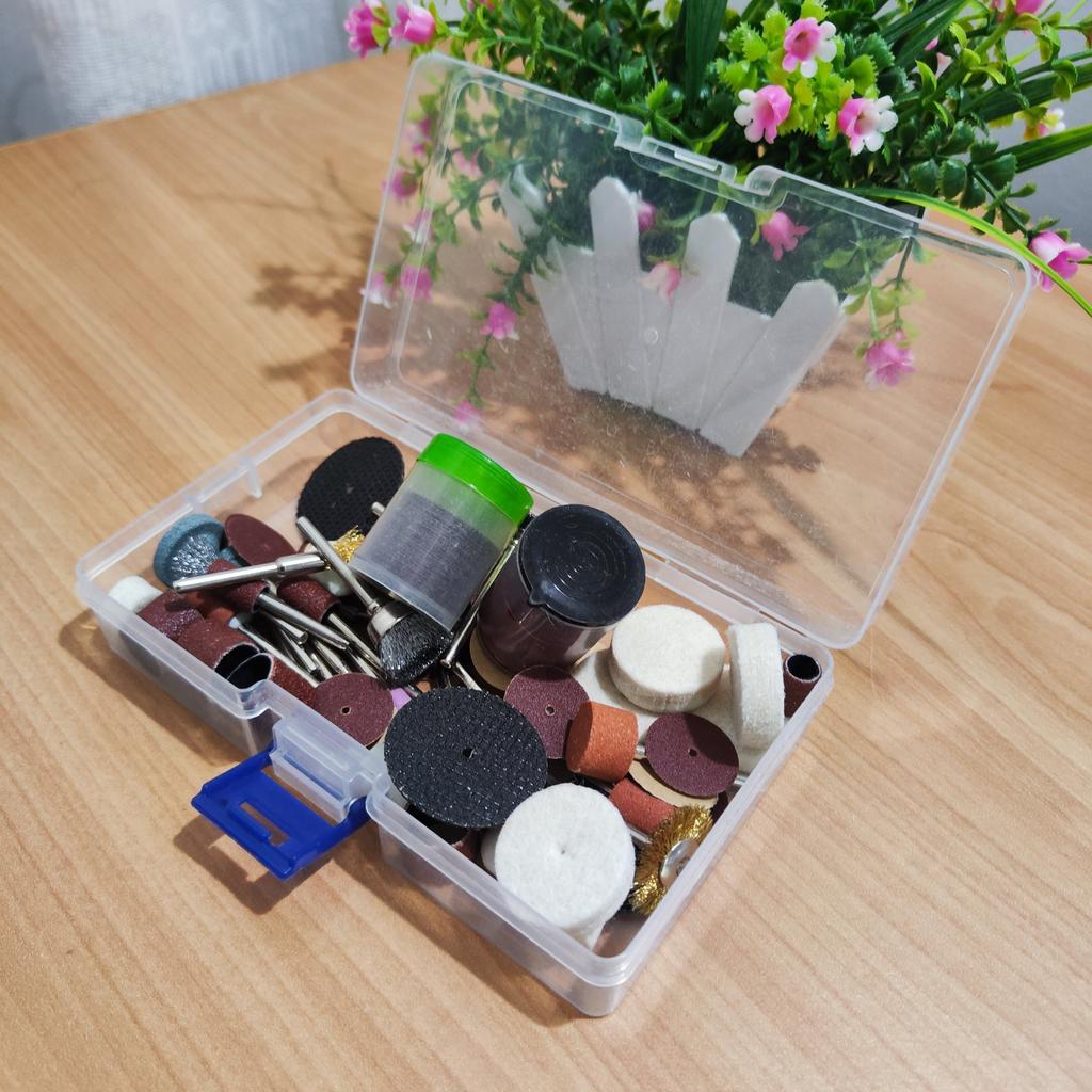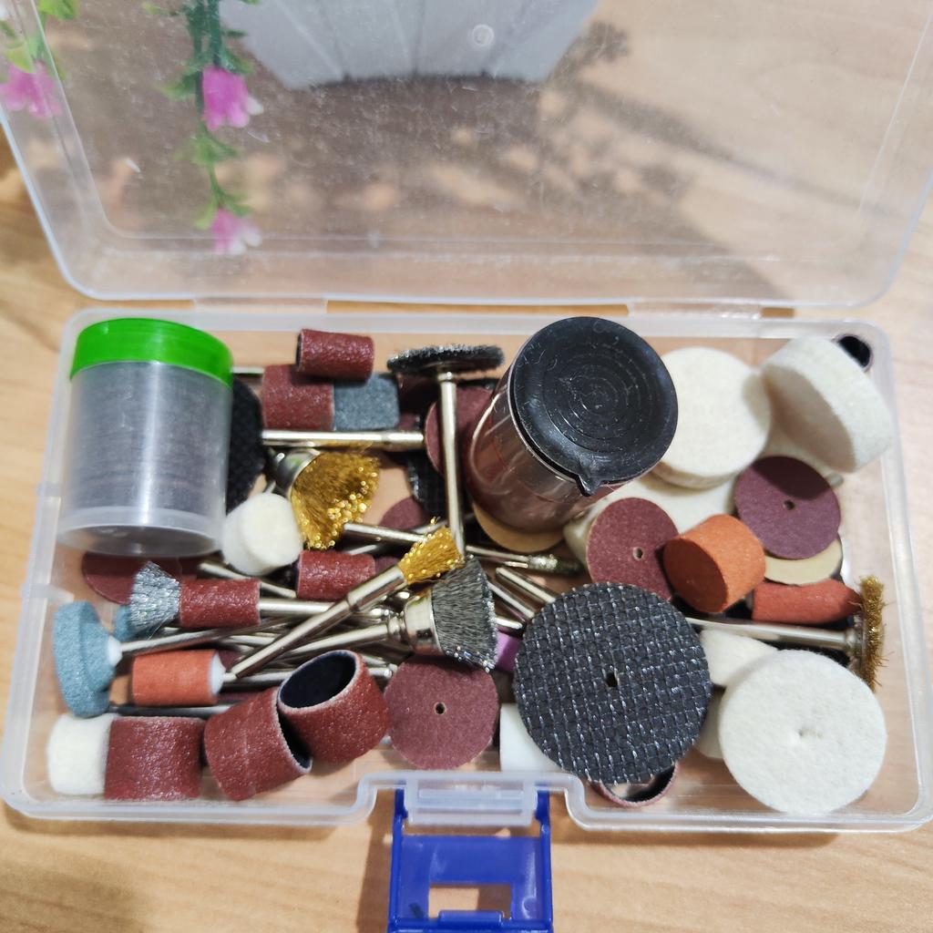 The 100-piece accessory kit for a rotary tool is a perfect solution for any DIY enthusiast or professional who needs precise and convenient power tools. The kit includes a wide variety of accessories for grinding, polishing, cutting, drilling, and engraving – making it ideal for working on wood, metal, plastic, glass, and more. *Outstanding advantages:* - Includes a universal chuck and spindle lock for quick accessory changes. - Suitable for common rotary tools such as Dremel and similar. - Allows for the execution of delicate work such as engraving on jewelry or handmade projects. - High-quality materials ensure long-lasting durability. Perfect for home use, craft workshops, or small repairs – one set that concentrates everything you need!