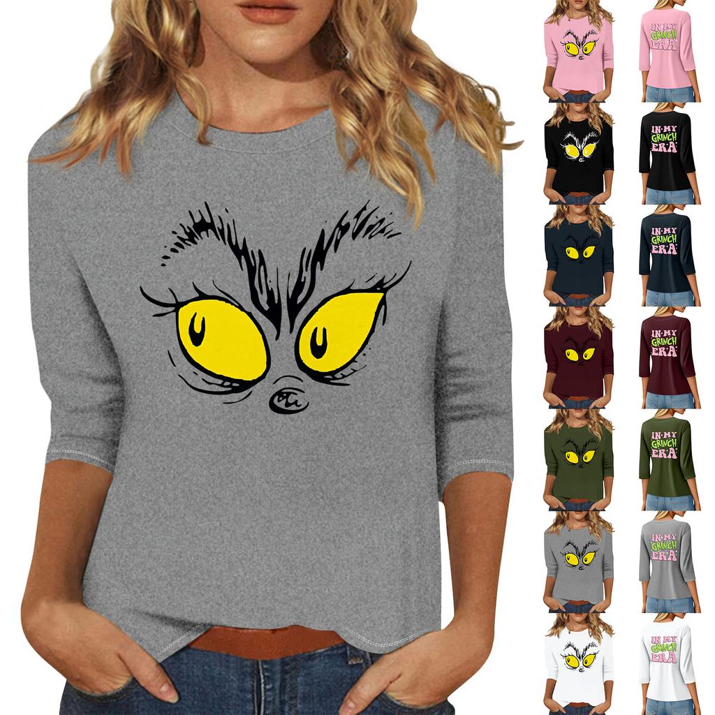 3/4 Sleeve Tops For Women T-Shirt Casual Christmas Print Tops T Shirt Round Neck Pullover Blouse