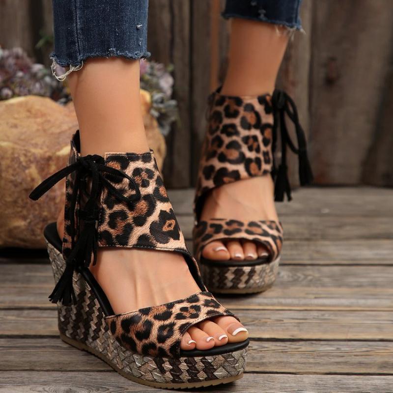 Women's Leopard Print Platform Wedge Sandals - Ultra-High Thick Heel with Golden-Tone Block Heel, Faux Cover Upper &, Zipper Closure — buy online with free worldwide shipping!