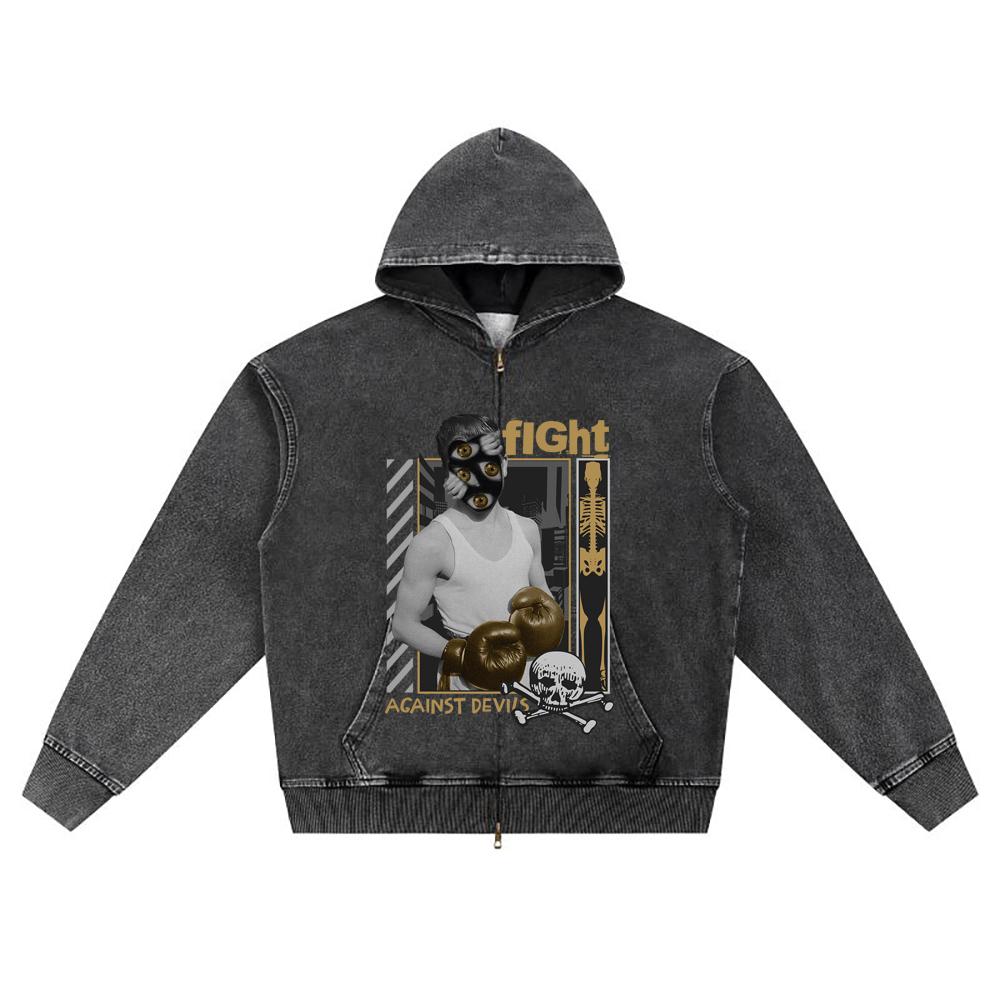 DTG Print Knitted Denim Zip-Up Hoodie Fight Brother Print Zipper Hoodies