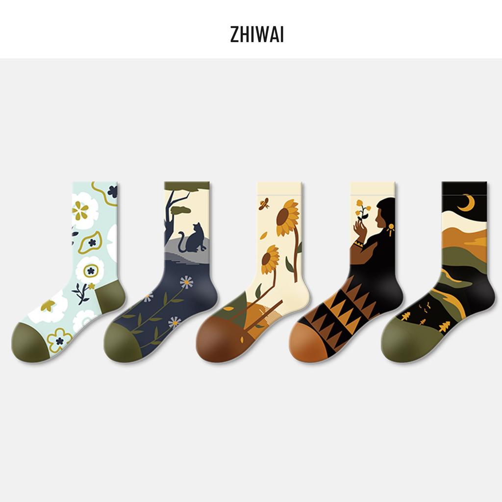 Women's Hand-Painted Floral Oil Painting Mid-Calf Socks - Retro Spring & Autumn Design — buy online with free worldwide shipping!