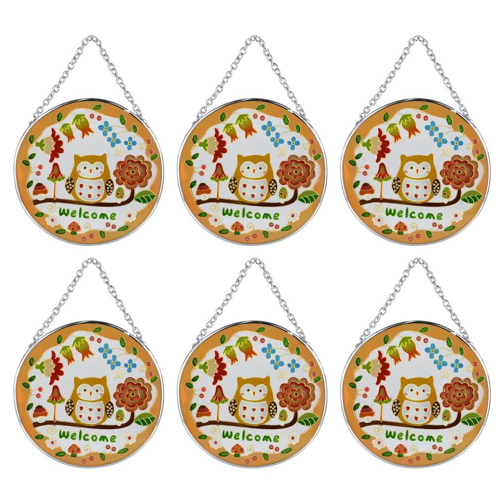 Fourcart Cute Handmade Glass Stained Frame, Fairytale Forest Owl Welcome, Round, Set of 6
