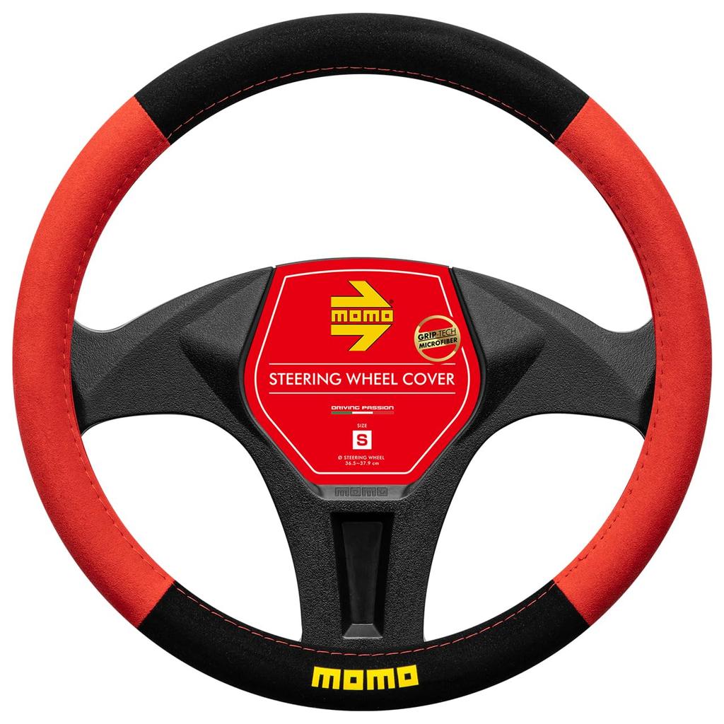 Black and vibrant red fabric with red stitching, and the traditional MOMO logo in its signature yellow.