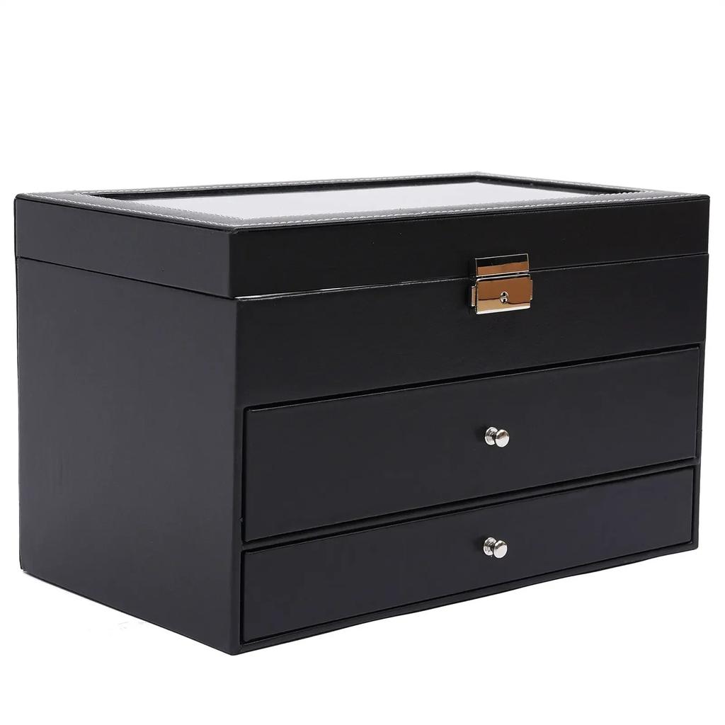 3 Layer Leather Watch And Eyeglasses & Sunglasses Box With Jewelry Display Drawer Metal Buckle Case Organizer Black
