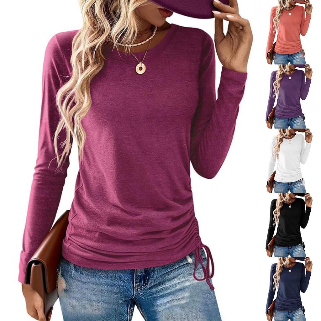Women's Fashion Round Neck Solid Color Long Sleeve Side Drawstring Loose Casual Hoodie T-shirt Top — buy online with free worldwide shipping!