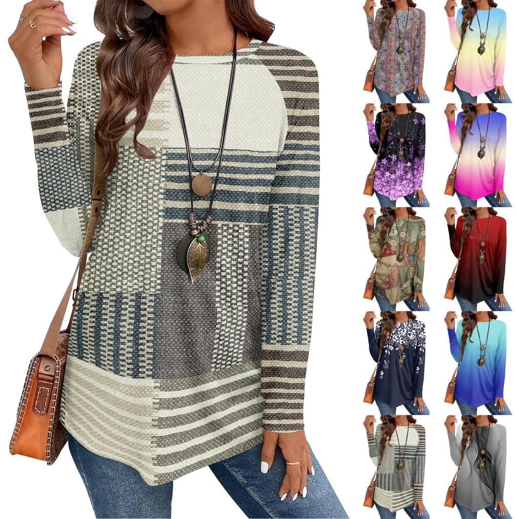 Women's Casual Plus SizeLong Sleeved Round Neck Vintage Ethnic Printing T-shirt Top Pullover