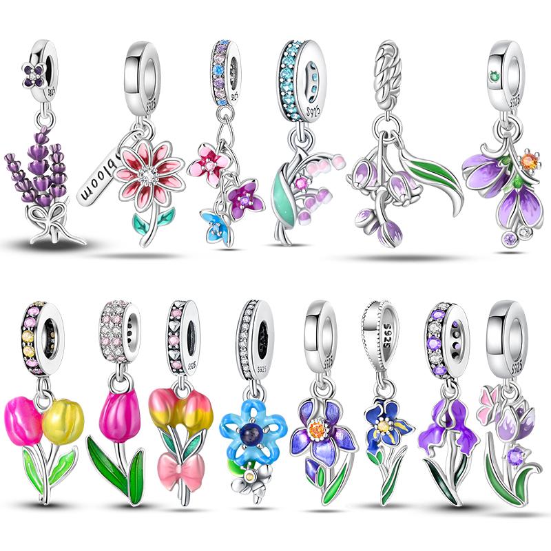 Copper Lavender Tulips Pansy Iris Charm Beads Colorful Flower Dangle Fit Original Bracelet Diy Jewelry Gift