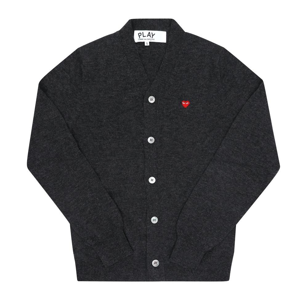This is the COMME DES GARCONS PLAY Small Red Heart Wappen V-neck Cardigan (Model: AX-N080-051 2). It is crafted from high-quality wool and comes in a classic gray color. This unisex cardigan offers both comfort and style, perfect for layering in cooler weather. Its playful design featuring the signature heart detail adds a unique touch to any outfit.