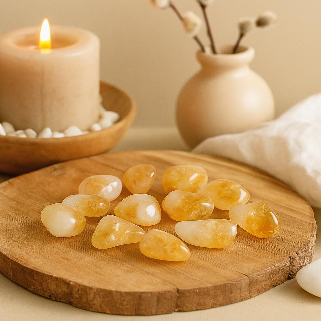 Warm notes of honey and light flow through these polished citrine tumble stones, their smooth surfaces revealing gentle gradients and tiny veils within. Formed deep in the earth and refined to a soft, high-gloss touch, they carry a quiet presence — calm companions for meditation, energy work, and intentional living. 🌞