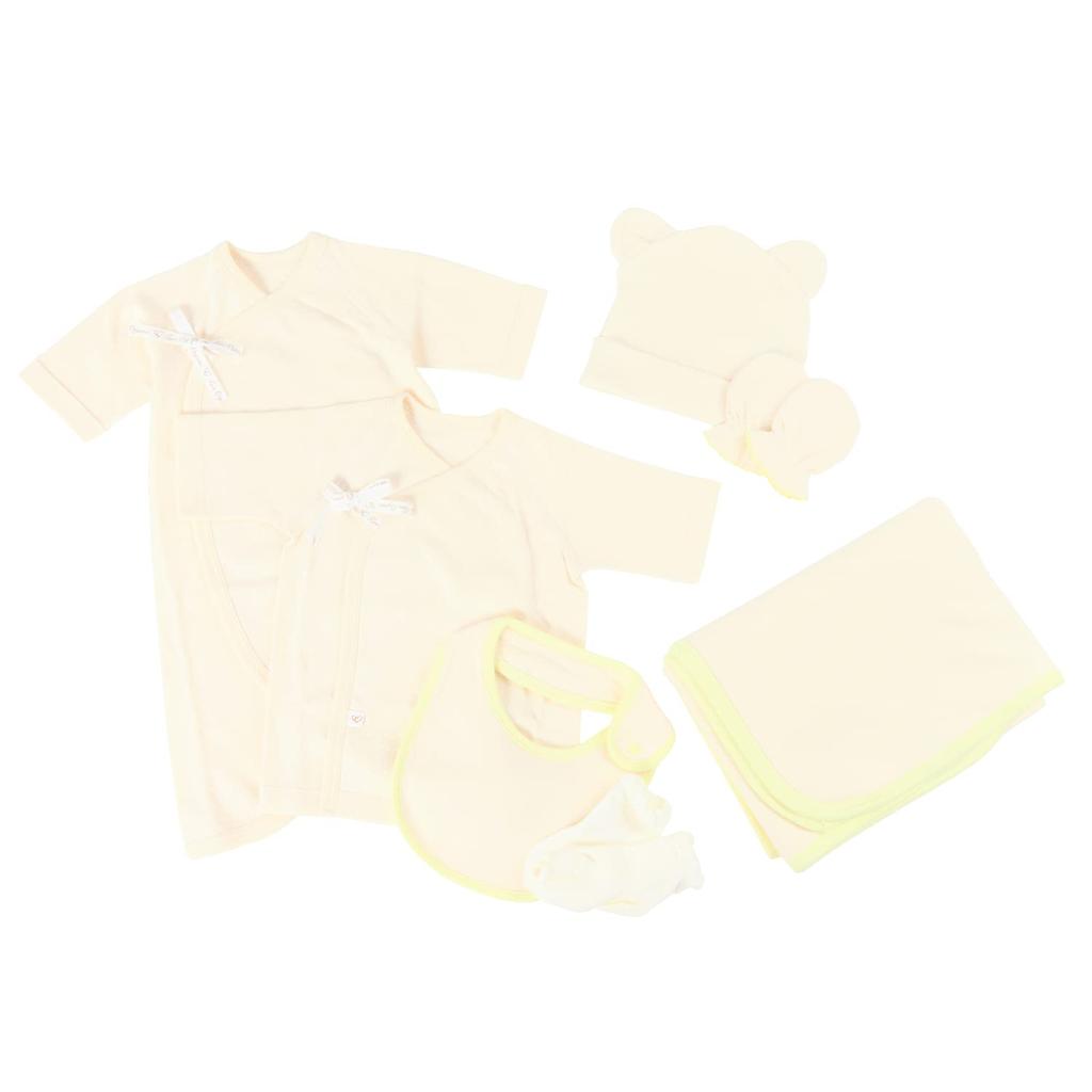 <Set contents> This set includes seven items: short fitted undershirt, combination fitted undershirt (ivory), swaddling cloth, bib, mittens (yellow), hat, and socks.