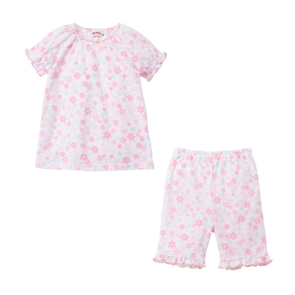 These Miki House short-sleeved pajamas feature an A-line silhouette and a floral print that's perfect for girls. They can be worn without buttons, making them easy for children to put on and take off by themselves. Made from soft jersey material, these Miki House short-sleeved pajamas are a popular choice for kids.