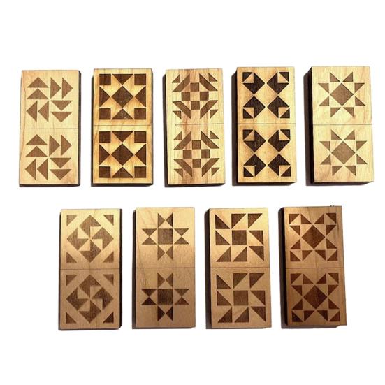 Introducing the quilt block tile set, a creative twist on the classic game of dominoes. Crafted from premium solid cherry wood, these tiles are not only durable but also beautifully engraved with intricate quilt block designs.