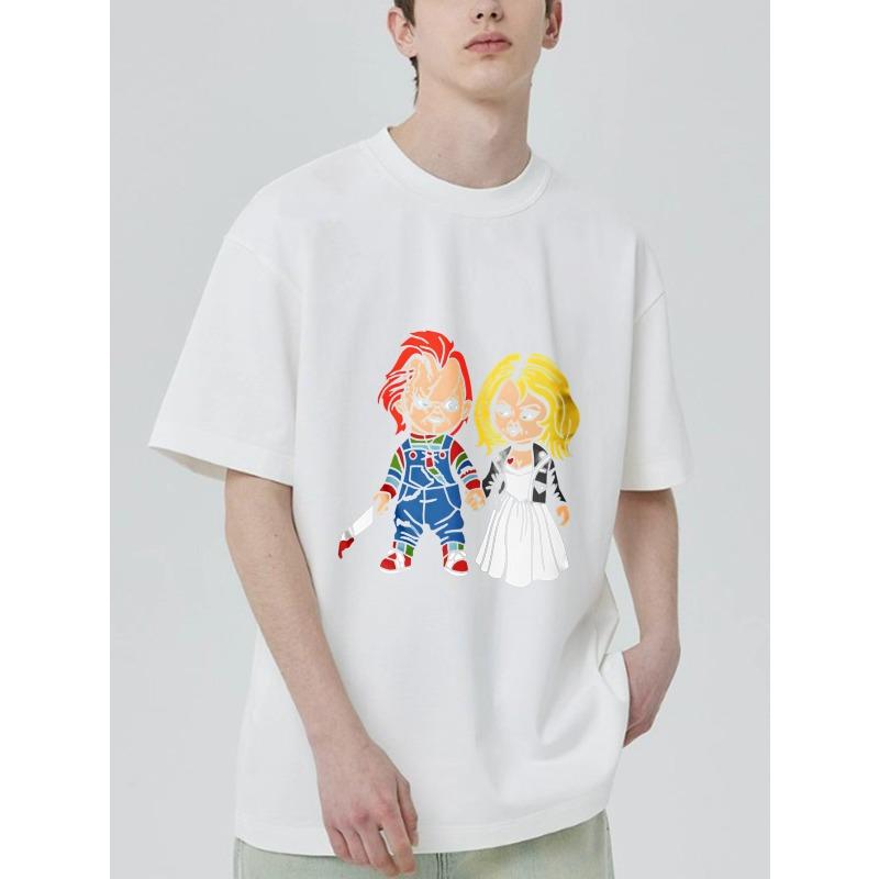 Chucky and Tiffany Cartoon T Shirt Black Horror Movie Characters Print Casual Wear for Men and Women
