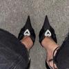 Черные туфли на высоком каблуке, острый носок, шпилька, ремешок из одного слова и универсальный темперамент, крутые шлепанцы.