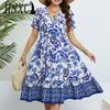 Женская мода лето весна цветочный принт с коротким рукавом V-образным вырезом с высокой талией повседневные платья