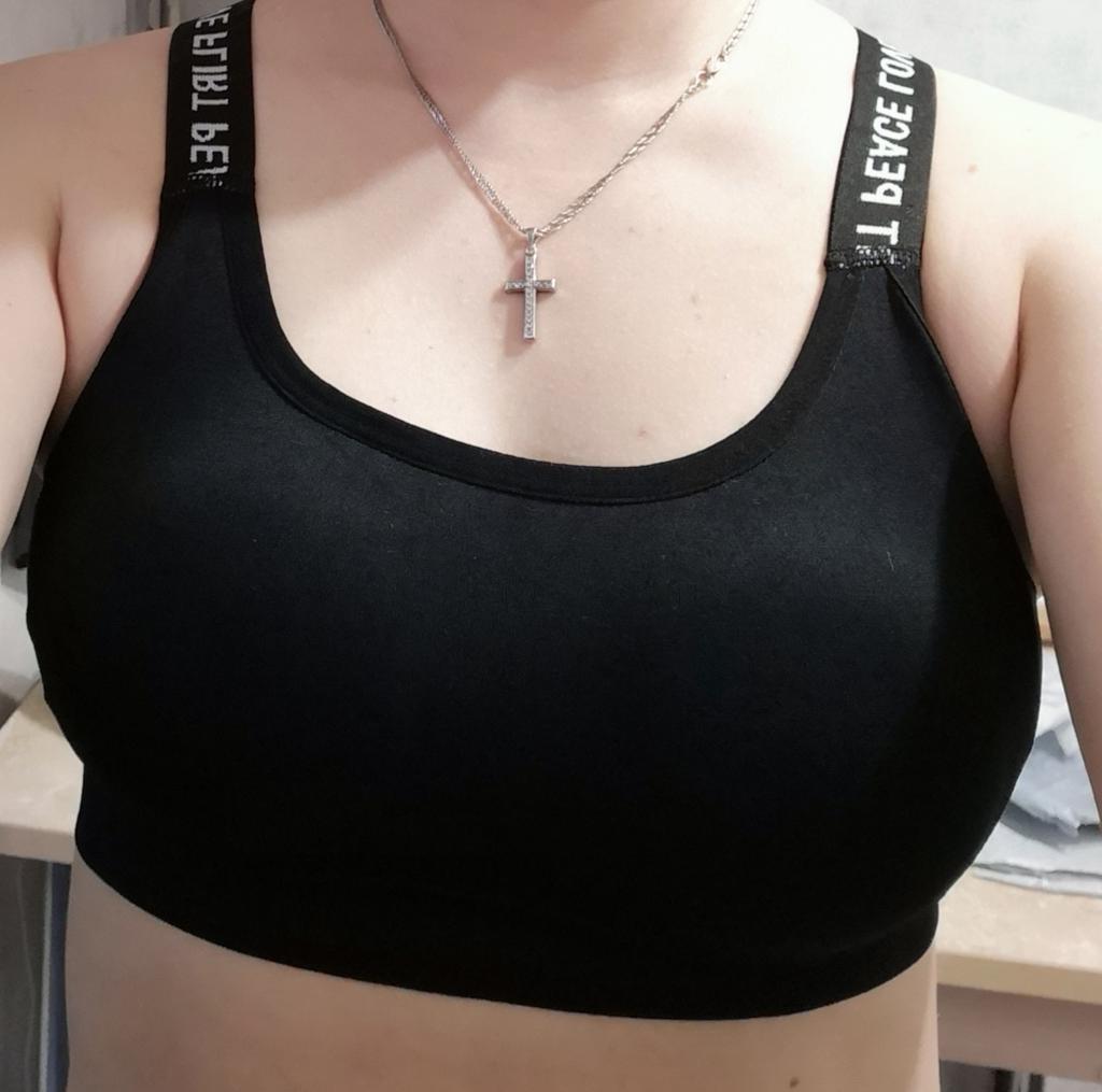 Топ пришел быстро. Товар целый, без брака и повреждений. Нитки не торчат и постороннего запаха нет,качество норм.Состав прописан на топе(фото)👍👍👍 На р.46 сел идеально,но т.к. рост 178 см и нет регулируемых брителек,то топ сразу под грудью.В спорт зал одеть не рискну пока не потренируюсь дома,чтоб не случилось казуса,и не пришлось его ловить на шее...😂 Как и говорили девочки чашки никакие ,вставлена тряпочка. Если вставлять чашки,то на липучках, т.к. отверстие под них сплошное,или рукодельничать...Меня устраивает товар полностью, я довольна! 👌👌👌 Спасибо продавцу и Джуму!♥️♥️♥️ Всем Удачных покупок!!!💯💯💯