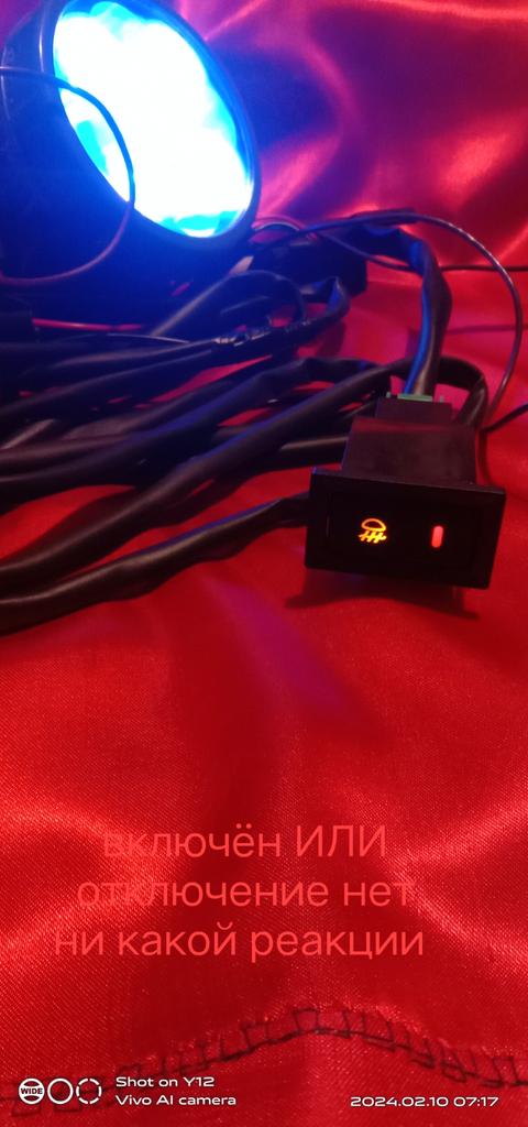 Сечение провода макс. 1,5 мм. кв. Реле и предохранитель на 40А. Вы серьёзно думаете, что предохранитель отработает? При подаче питания - светит индикатор ПТФ(должна включатся после включения габаритов) Кнопка с фиксацией. После нажатия - загорается светодиод.