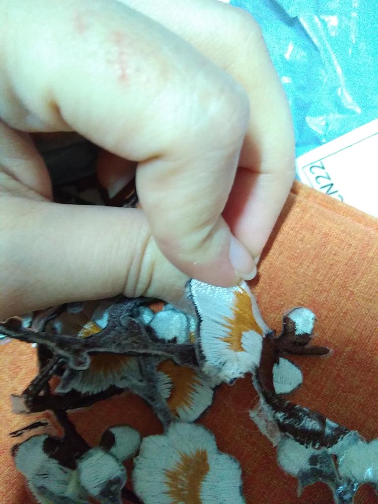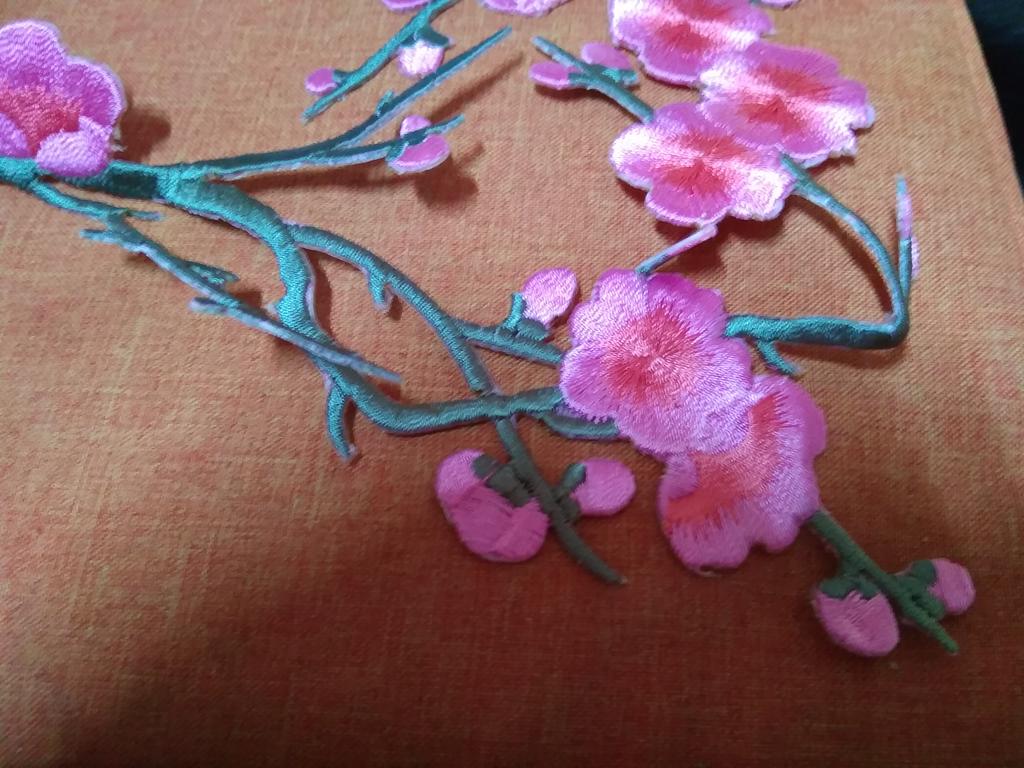 Ужасно некачественно пошито, есть свободная от нити основа, перерез сильный - нитка отваливается, один цветок с мохрой от швейной машины, есть кусок без клеевой подложки... Розовая намного лучше, хотя существенно ярче образца. Маленький пакетик бросили в почтовый ящик, многократно свернутая аппликация без какой-либо защиты
