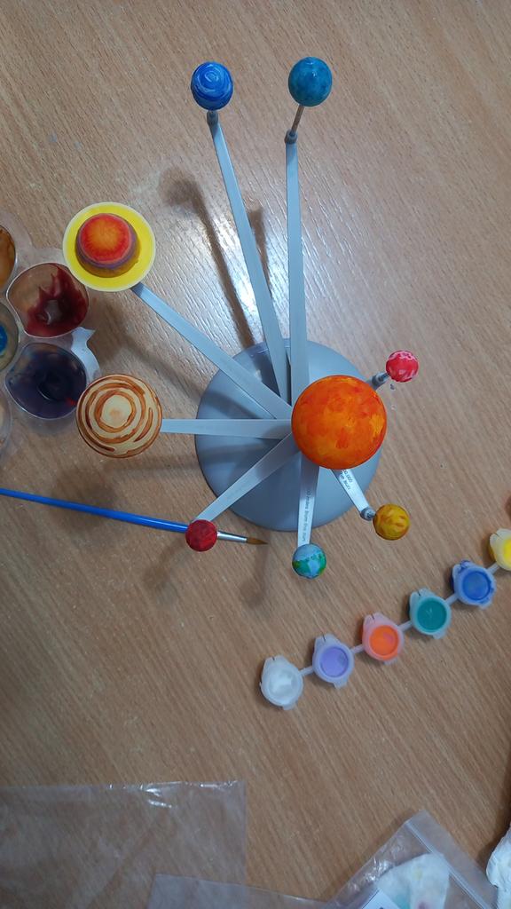 Очень интересная штука. Всем понравилось. Всё целое, упаковано хорошо. Но вот держатели, на которых держатся планеты 2 штуки под разными углами, так что прокрутить по очереди не получится. Краски жидковаты, по пластмассу довольно тяжело красить. Краска высохает и очень легко стирается с планет при нажатии. Поэтому 4 звезды. Но в прочем нормально.