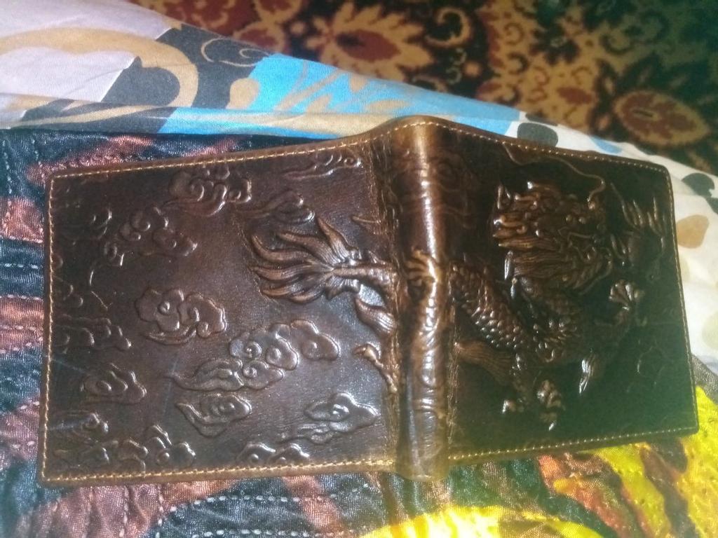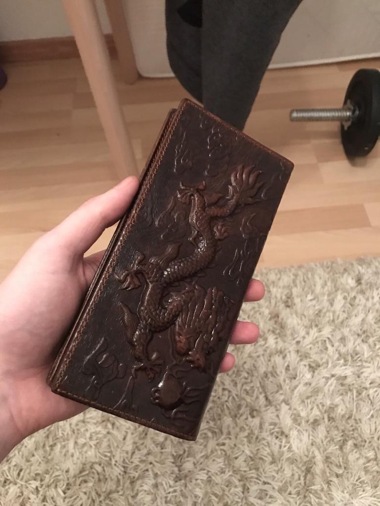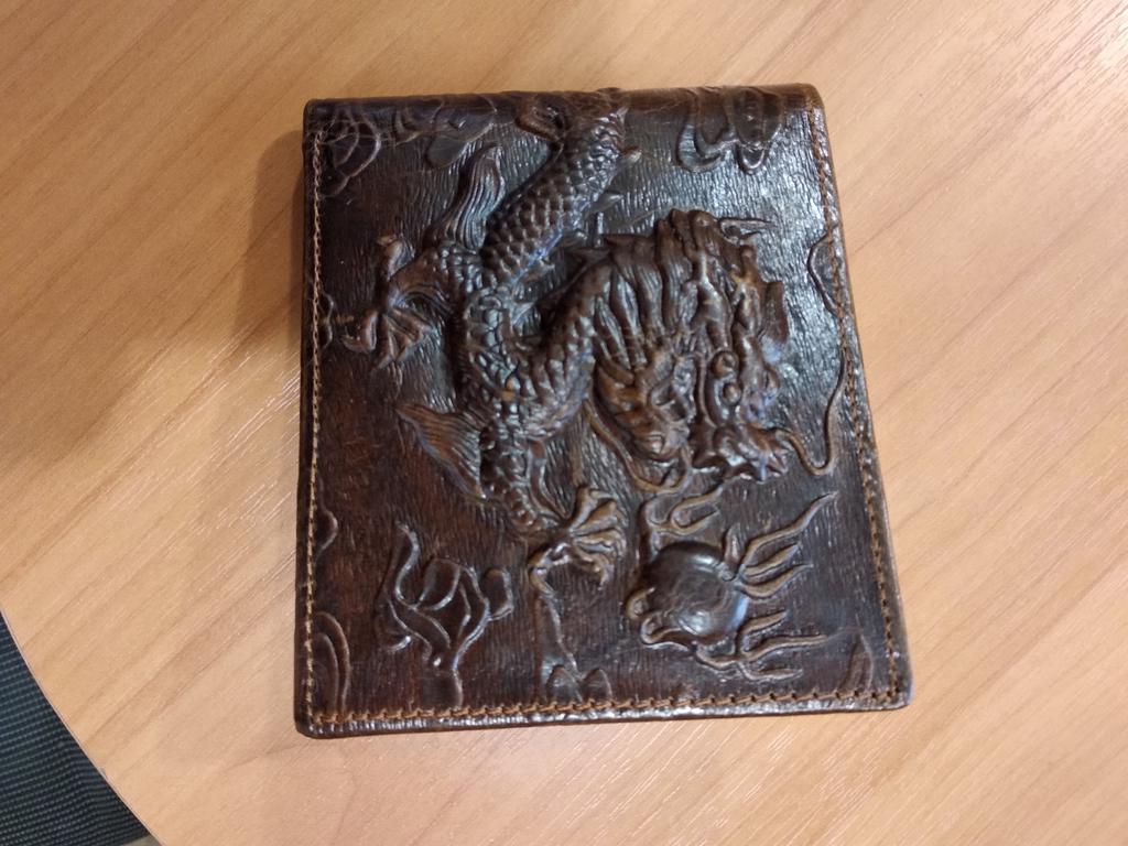 Портмоне имеет запах кожи что естественно, большое количество отделов под скидочные карты, под купюры три отдела и плюс ещё один на молнии, необычный дизайн с текстурой дракона, строчка ниток ровная. В приложении отслеживалась