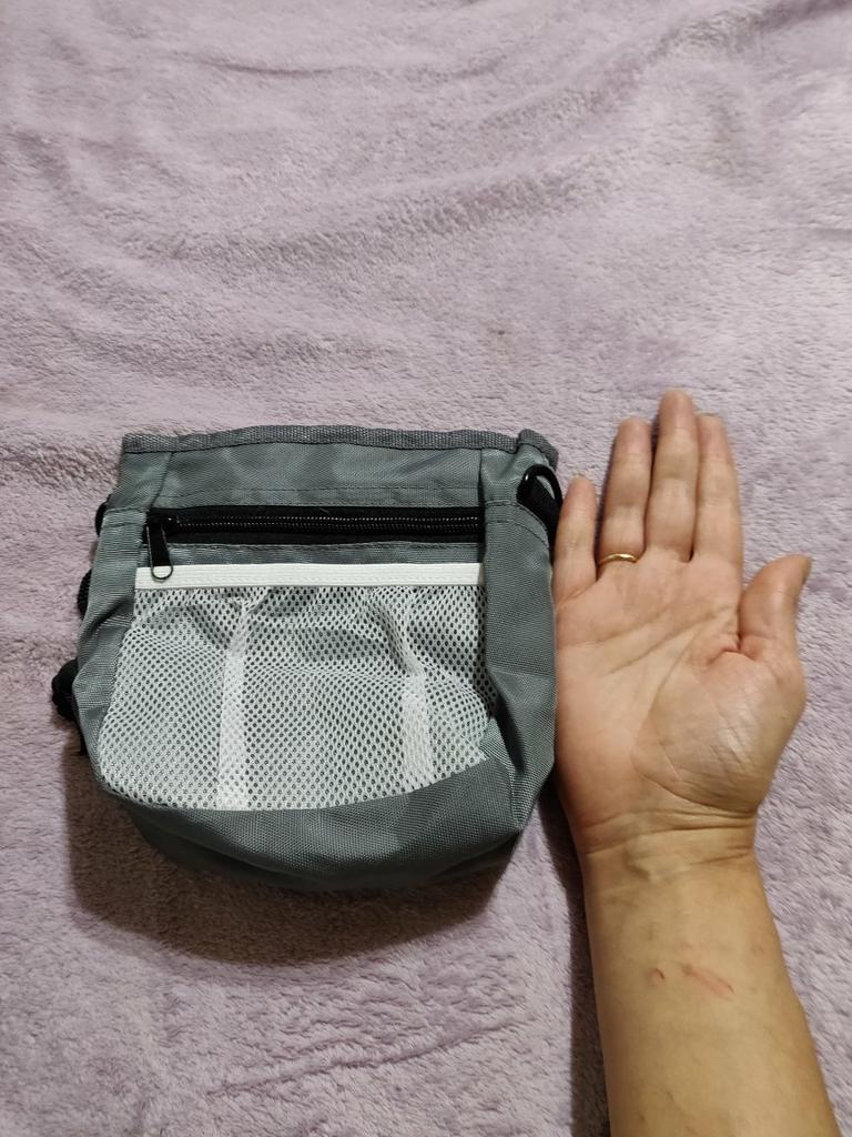Заказ до Балашихи шёл 3 недели. В сумку поместится маленький поводок-рулетка, вкусняшки пакетики для какашек, можно положить ключи, телефон тоже влезет). Короче удобная вместительная сумка, можно носить на животе (есть специальный ремешок) на плече (тоже ремешок) и крепить к джинсам