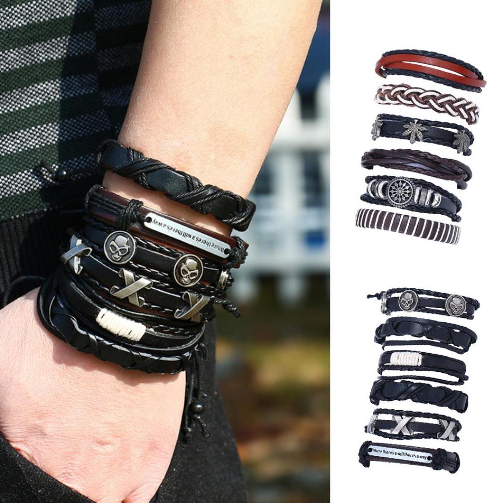 6шт ретро мужские искусственная кожа хип поп-панк череп лист оплетка браслет наручные украшения — купить товар онлайн с бесплатной доставкой до всему миру!