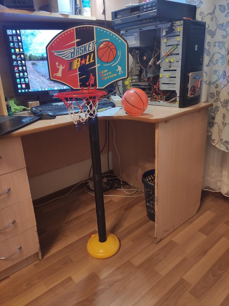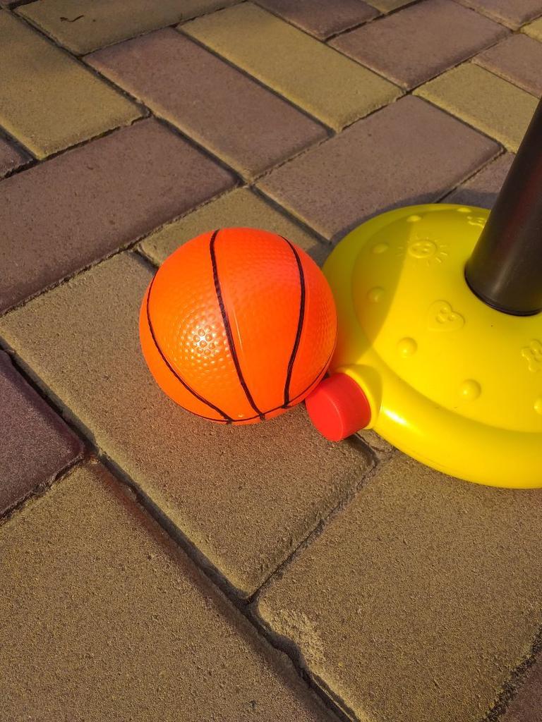 Маленький мячик в комплекте - прекрасный и прыгающий. Положили аж 2 качка для мясика и детскую раскраску с таблеточными красками. Высота самого кольца очень небольшая. Конструкция (сам столб, пластмассовый) мнется. Для бережного использования.