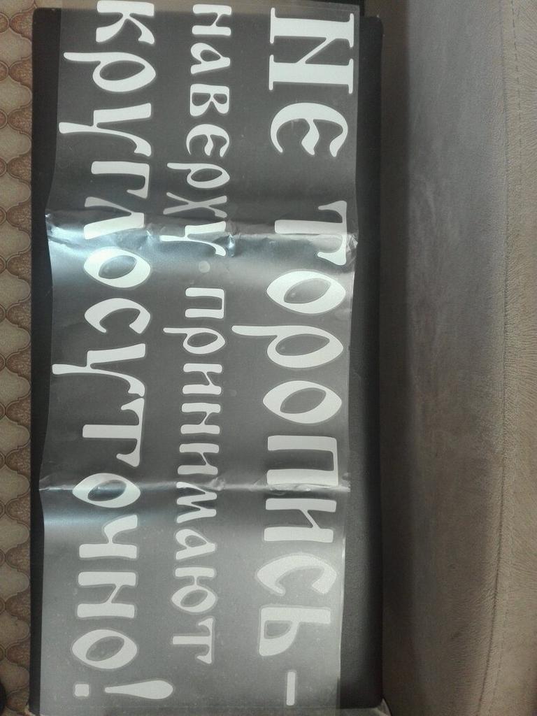 Мятая наклейка, к тому же при попытке наклеить. Часть букв осталась на одной стороне, часть на другой. Если только их отуовыриваать и наклеивать по одной при этом ещё стараться выровнять, и где мятые неизвестно сколько продержаться. Так клёвая основа повреждена.