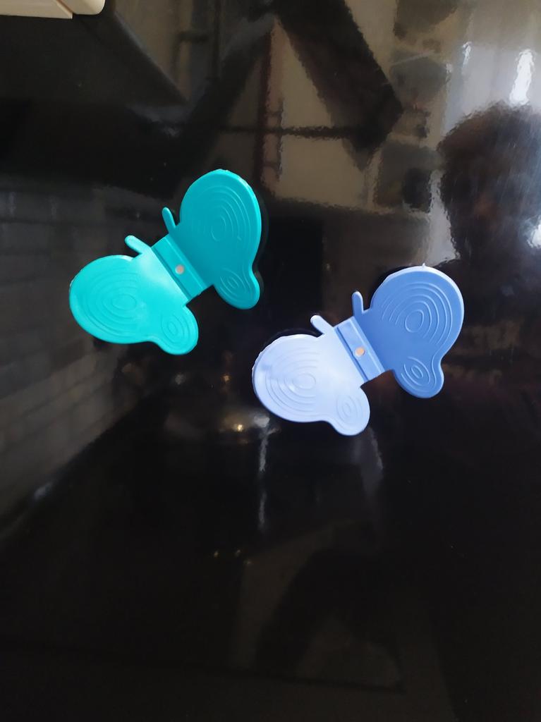 Селиконовые прихватки в виде бабочек. Мне прислали в двух цветах. Хотелось бы другой цвет, ну почему нельзя выбрать? Сами бабочки удобные, размер хороший. Очень удобно ,что с магнитиками. Всегда под рукой.