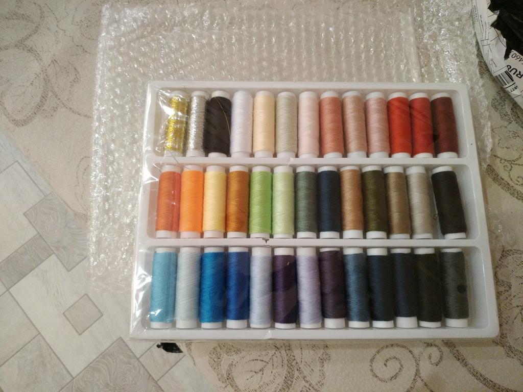 нитки пришли в картонке, форма, где они лежат сломана, цветов много, часть яркие, есть золотая и серебрянная нить. Есть минус - ниток очень мало, практически на катушке их нет, надолго не хватит