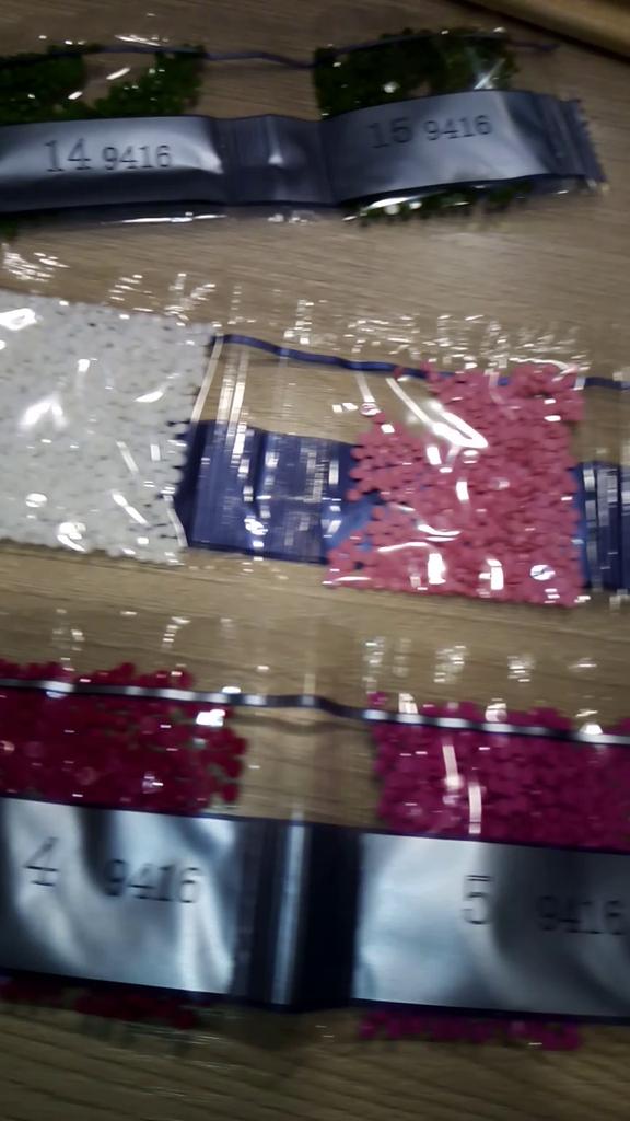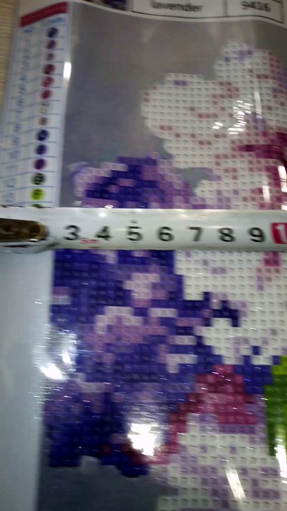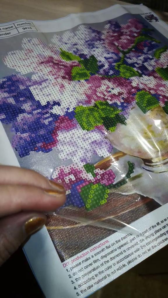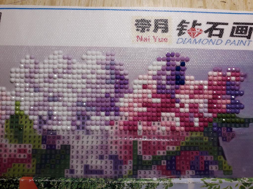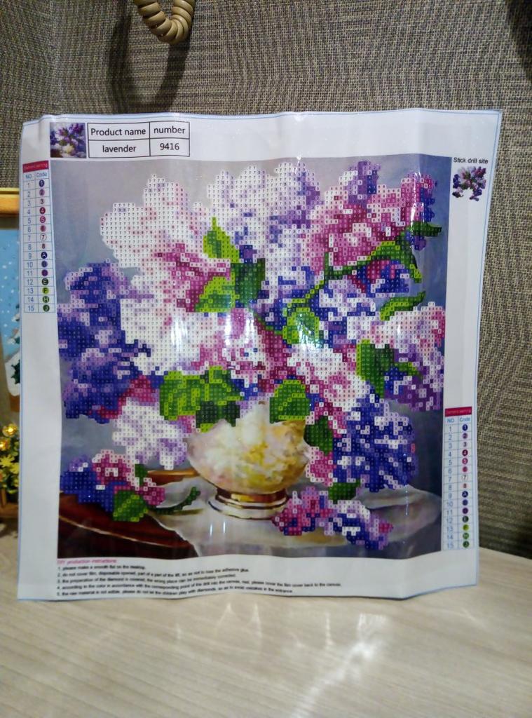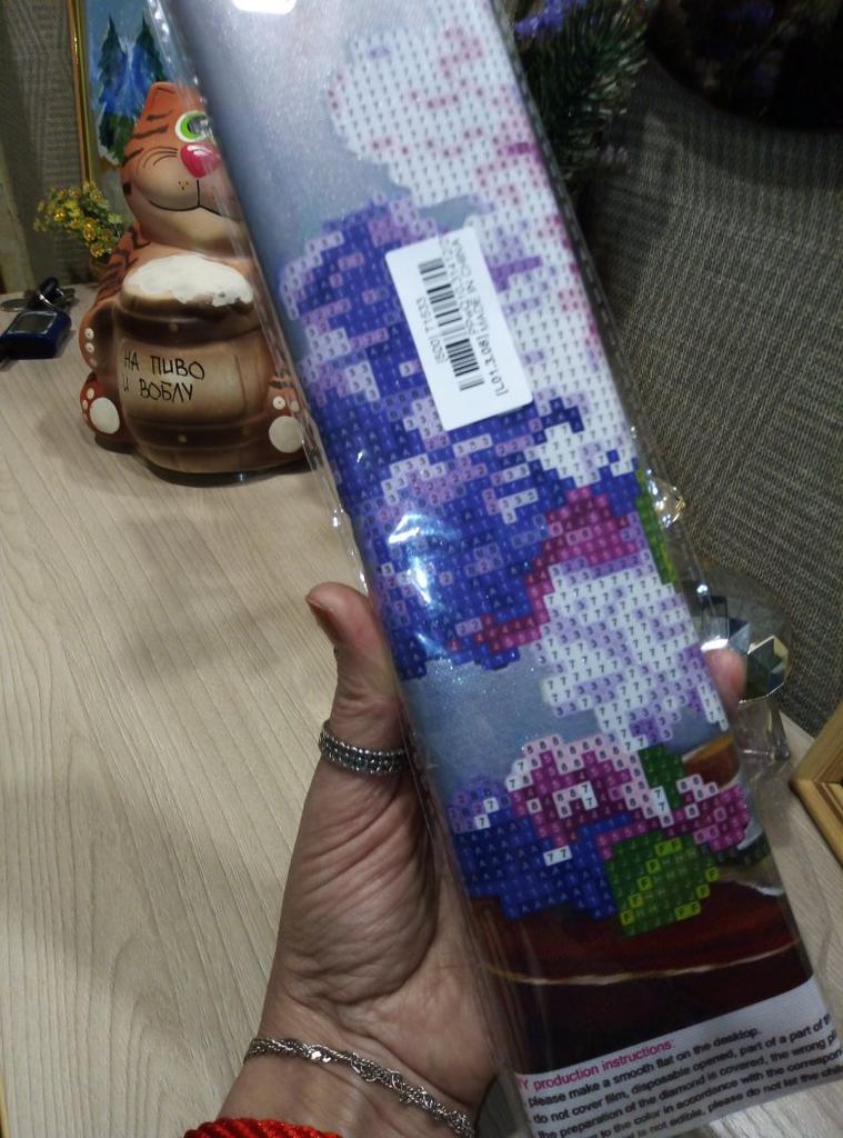 Доставка около 3х недель, отслеживание частичное ( по России не отслеживается). Упаковка не повреждена, все хоршо заклеено. Картинка свернута и соответственно помялась по местам сгибов, но это не страшно - выпрямится. Выкладка почти полная, остается фон, стол, ваза и салфетка. Размер рабочего поля 25×25см, а не 30х30, как заявлено продавцом. Начала собирать, и обнаружила некоторый косяк... может только мне так не повезло, но один цвет выбивается из общей картинв, как будто не тот цвет страз положили(темно-синий, вместо темно-фиолетового). Попробую чем-то заменить...
