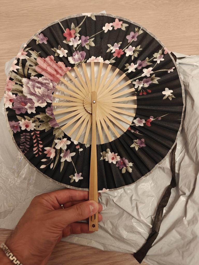 Прикольный веер. Довольно большой. Не думал что не фиксируется в открытом состоянии, немного пружинит обратно. Судя по реакции, супруге удобней обычные, но он тоже позабавил.