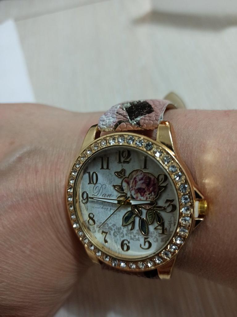 Заказом очень довольна! Пришло за чуть больше чем две недели. Кинули в почтовый ящик. Выглядит очень богато, все камешки на месте, выглядят даже лучше, чем на фото. Единственное, что смотрятся массивнее, но мне это даже понравилось. Ремешок довольно большой. На запястье 16 см примерила на предпоследнюю дырочку и часы свободно. Трек отслеживался не полностью.Ходят без нареканий, не отстают. Продавца рекомендую!!!