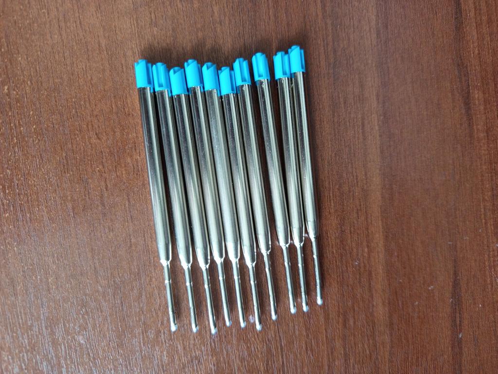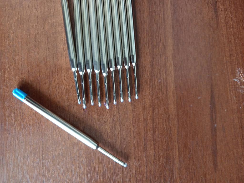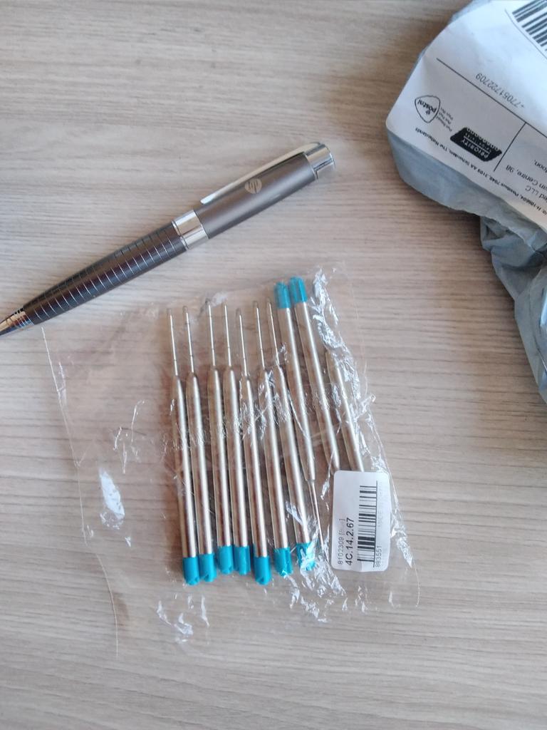 Стержни пришли в простом, упаковочном,прозрачном, полиэтиленовом,запаенном пакетике. На пишущем шарике сидит предохранительный силиконовый колпачок. Пишет синей, привычной нам, пастой. Не хуже фирменного «Parker”. На корпусе нет фирменных логотипов. Корпус стальной, ровный. Производителя и продавца рекомендую. Заказывайте и не переплачивайте.