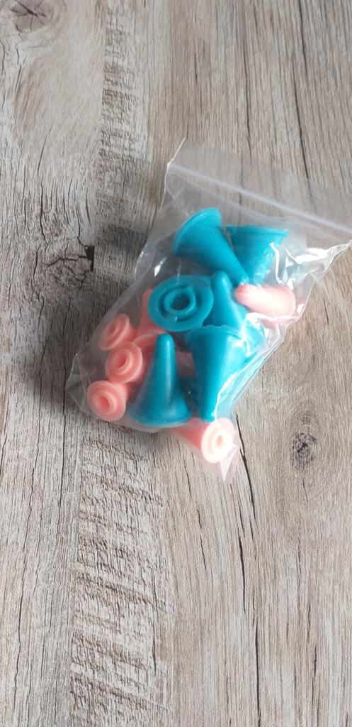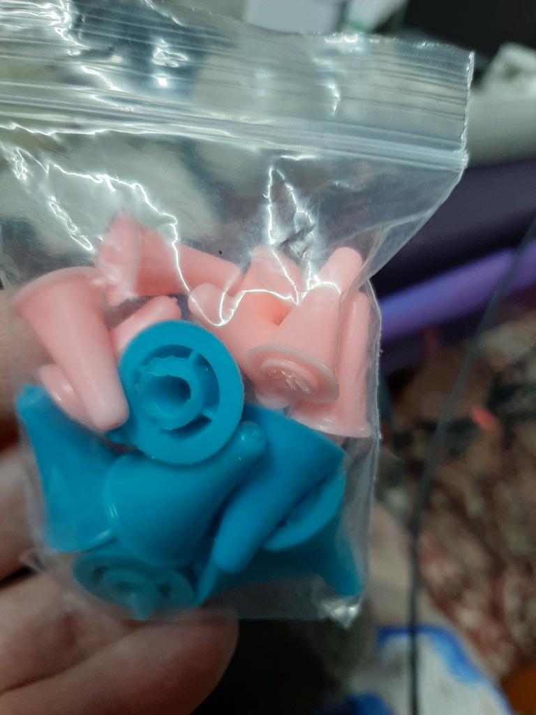 Получила наконечники для спиц. В 2-х размерах. 8 штук синего цвета, для спиц большего размера,и 8 штук розового цвета,для спиц меньшего размера. Литье немного не аккуратное,но это не страшно,за такие деньги. Всем рекомендую,очень классная штука.