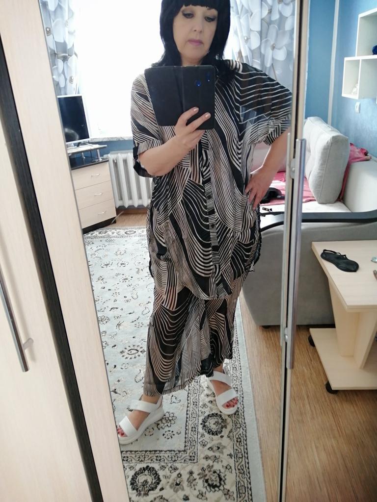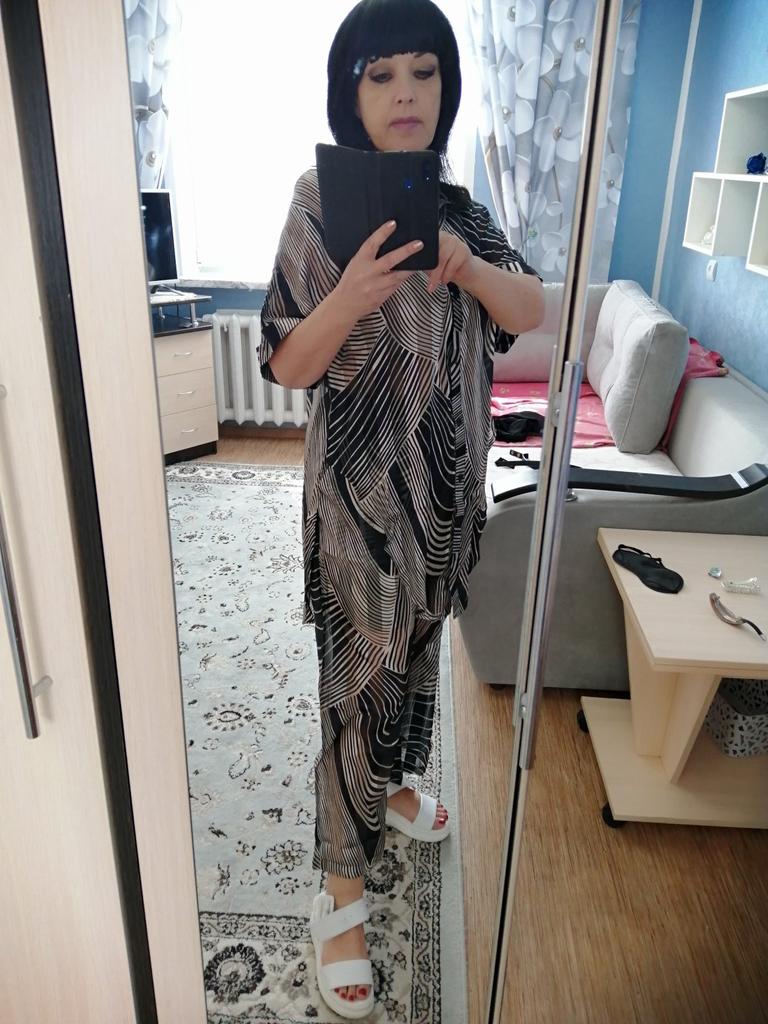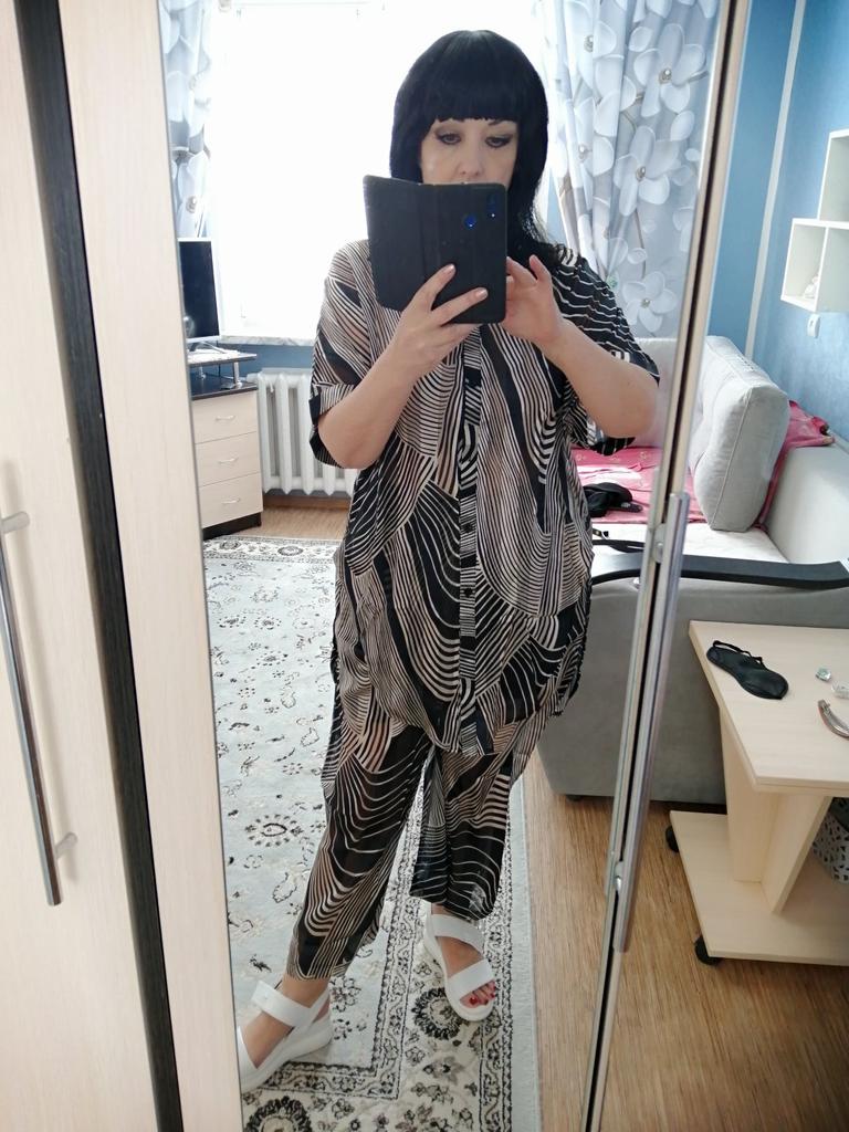 Оч. Хорошо упакован, мне на размер 48-50 подошёл. Оч. Лёгкий и приятный к телу, для жаркой погоды, немного эликтролизуется, но это пустяки, есть антистатик. Верх и низ можно ктмбинировать с другими чёрными и белыми вещами гардероба.