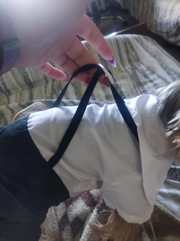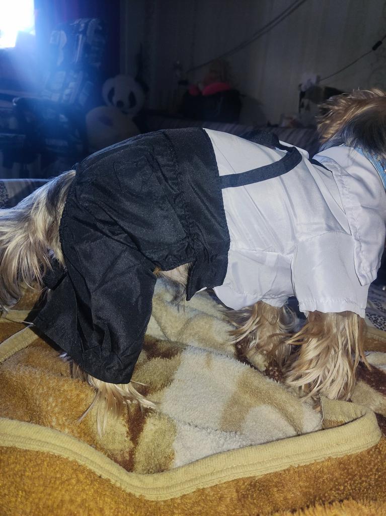 Костюм понравился..смотрится прикольно на йорка 3кг спинка 29 см. Сел отлично...не знаю писали в отзыве что у этого костюма длинные задние штанины... я ничего подобного не заметила...собачка моя небольшая в высоту...