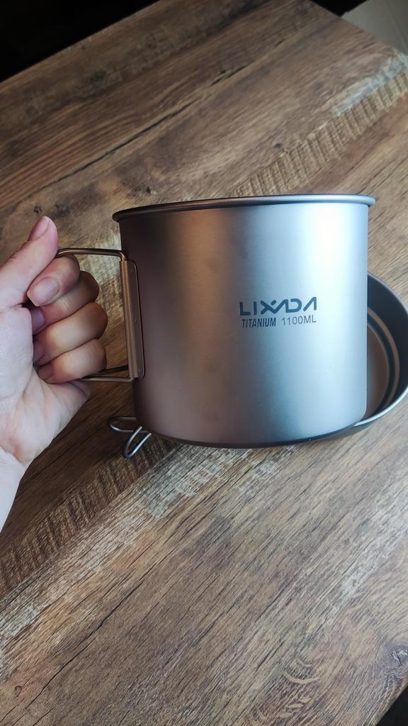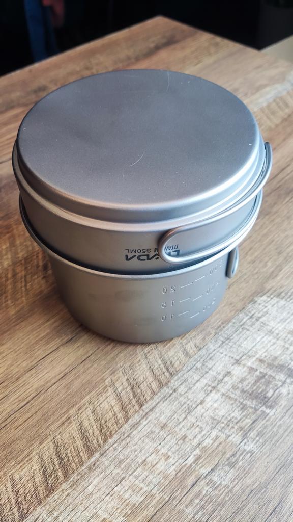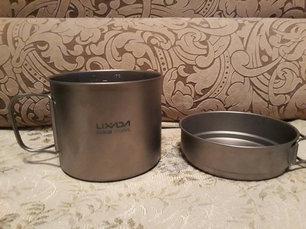 Суперлегкий походный котелок Я бы сказала, целый походный набор: котелок побольше и поглубже (1100мл), котелок поменьше 350мл (для второго или каши, например) и мягкий дышащий чехол. У обоих котелков отгибается ручка при желании. На корпус нанесён литраж. Набор очень лёгкий и очень прочный👍 не боится огня, не подвержен коррозии, легко убирается в чехол. Маленький котелок можно ставить сверху на большой или использовать его как крышку, чтобы содержимое лучше держало температуру. Материал титан. Есть в двух вариантах: с большим котлом на 900мл или на 1100 мл, у меня тот, что побольше.