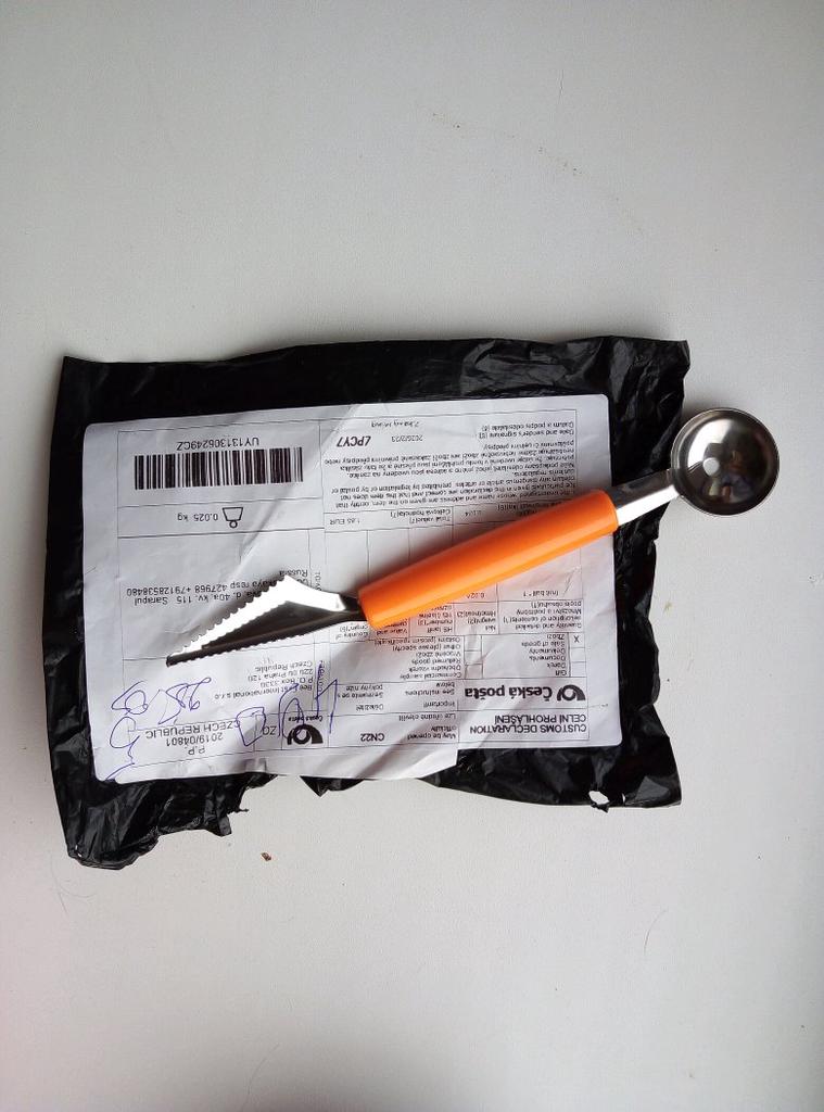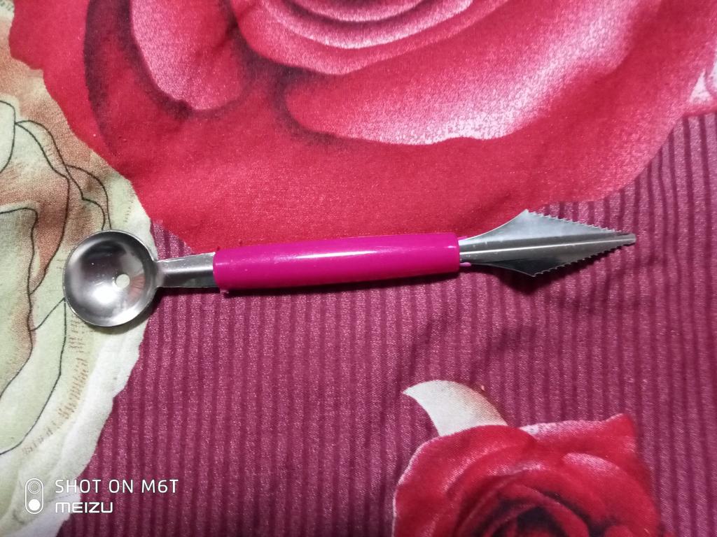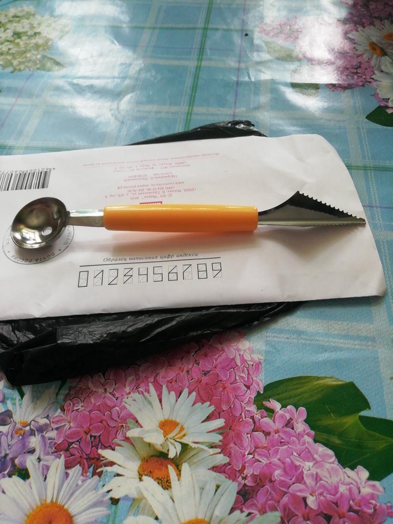 Резец для вырезания фруктов я заказала 24 августа. Получила в почтовом терминале 20 сентября. До Эстонии посылка шла почти месяц. Упаковка не нарушена. Интересный резец .соответствует фото. Теп4рь интересно плпробовать его в действии. На фото очень красиво выгдядит как из арбузов и дынь вырезают такую красоту. С одной стороны резец.с другой стороны ложечка.продавцу 5