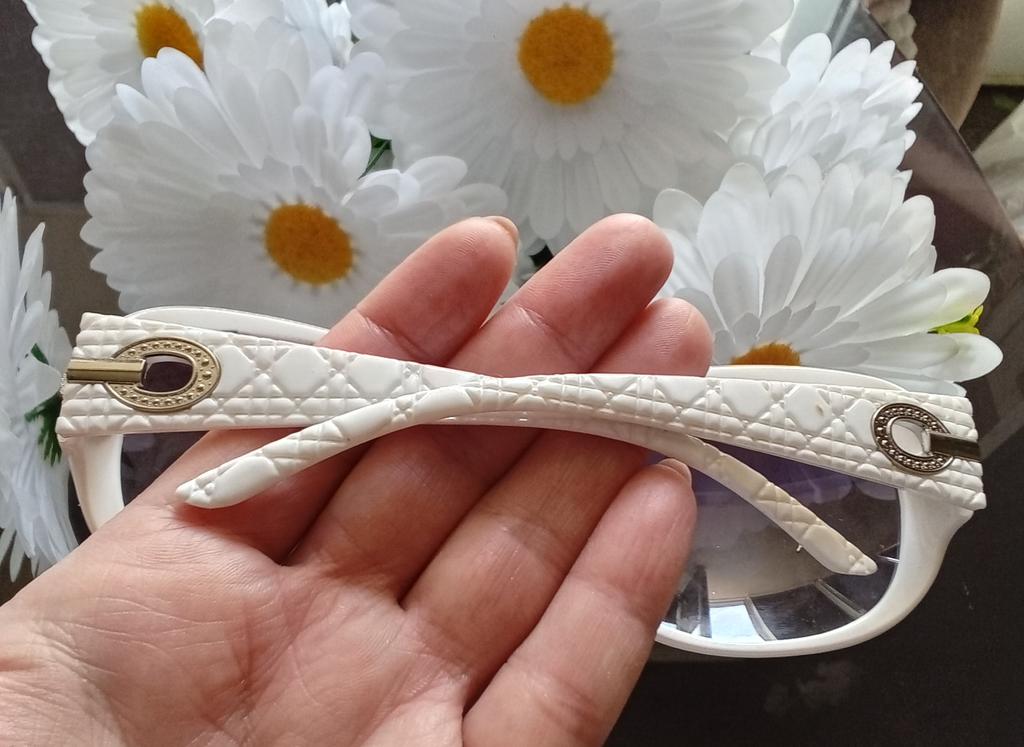 Классные солнцезащитные очки 🌞🌺🌼 Очки с пластиковой оправой белого цвета.👍с фиалетовыми линзами. Линзы пластиковые ☝️ Мостик пластиковый ☝️ Шарниры хорошо складываются и раскладываются.👌 Дужки за ушами держатся отлично 👍💯 Очки понравились 👍,на лице сидят хорошо,прилегают к нему, не сдавливают виски и не давят на переносицу.👌 По качеству претензий нет, всё отлично 👍💯 Очки приехали в целостности, в пакете, всё аккуратно и надёжно упаковано.👍💯 Рекомендую 🤗 к покупке.