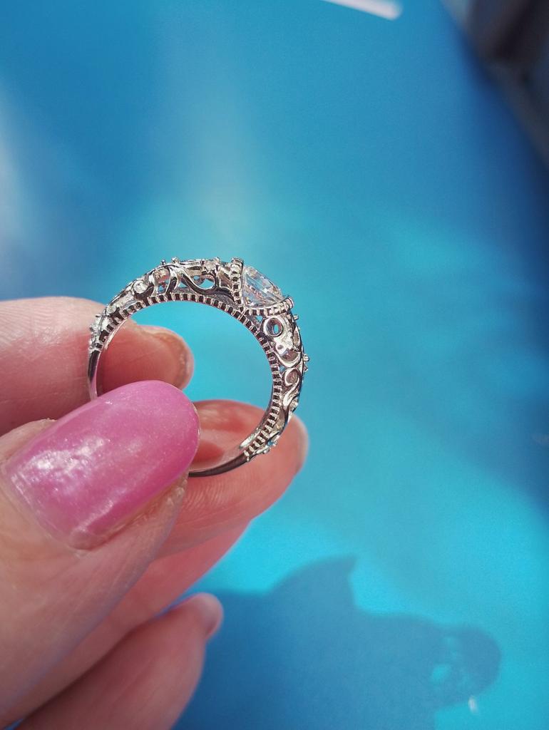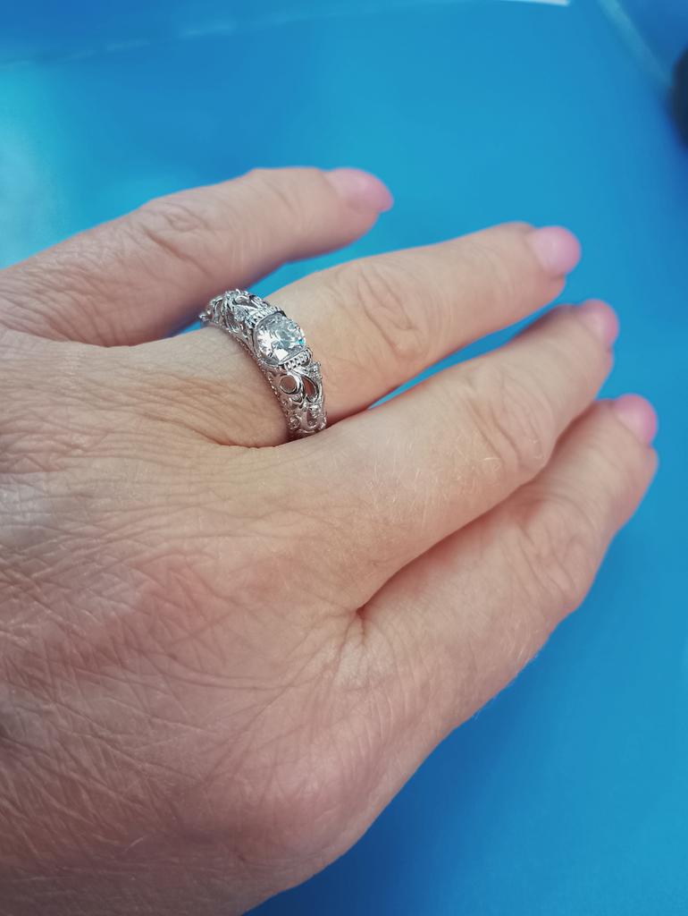 Изумительной красоты колечко. Искрится и сверкает, подобно снежным кристаллам - особенно ярко при вечернем освещении. Да оно и по дизайну напоминает зимний узор за счет ажурного металла (есть 925 проба) и легкости. Я его берегу, перед мытьем рук стараюсь снимать. Пока не потемнело, хотя 2 раза под воду с мылом попало. Хотелось бы к нему подобрать серьги или кулон с таким же ажуром и сверкающим цирконом. Большое спасибо мастерам, продавцу и Джуму!