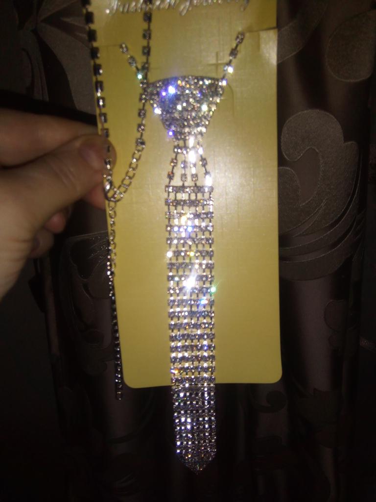 Колье из страз. В виде галстука. Красивое! Все камешки на месте. Здорово блестят на свету. Длина «галстука» с «узлом» 20 см. Длина основной цепочки с камешками 32 см (по моей довольно тонкой неё сидит плотно) + 28 см дополнительная цепочка. Заказала с купоном на скидку за 298,3 руб. Информацию о доставке в почтовое отделение получила через 23 дня после даты заказа. Пришли 3 посылки в одном пакете. За время доставки товар не пострадал, так как был довольно хорошо упакован.
