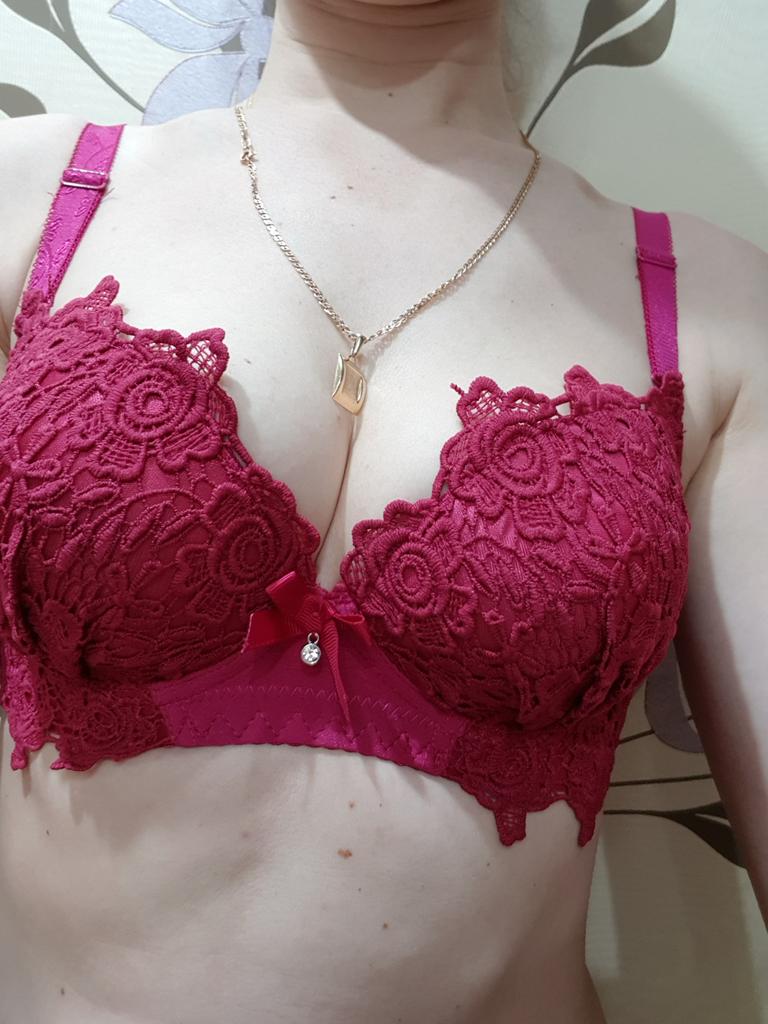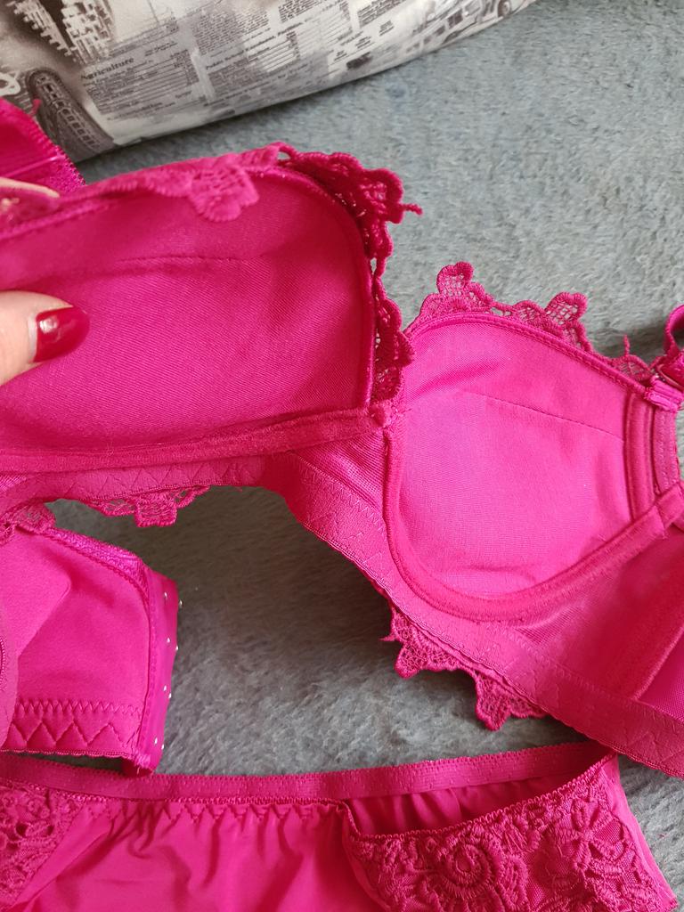 Комплект белья мне понравился, симпатичный и симметрично кружево пришто, но вот лямки...одна наоборот..думаю перешью. За это и сняла 1 звезду. По размеру подошёл. На ОГ 92 под бюстом 77, ОБ 98 сел хорошо. Пуш-ап есть , хороший , мягкий, удобный ( для меня этот момент очень важен, т.к. после рождения детей грудь есть))), но как бы пустая). Трусики тоже хорошо сели, не пережимают, синтетические, но приятные к телу. Думаю, что закажу ещё и другого цвета, только попробую в носке.Заказ шёл долго - 6 недель. Цвет при дневном свете больше как "фуксия", а по фото мне показался как "винный красный", но это комплект не портит. Дополняю: Можно смело покупать бюст 85 на мои параметры ( лиф в пору , но застёгиваю на крайние крючки и хотелось бы чуть посвобрднее, жарой вообще вопьётся в тело). В другом цвете закажу 85. А так хороший, грудь выглядит округлой формы, приподнимает хорошо.